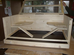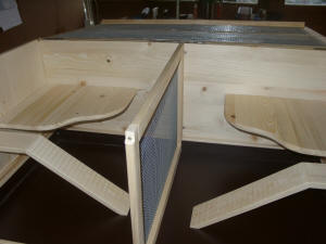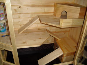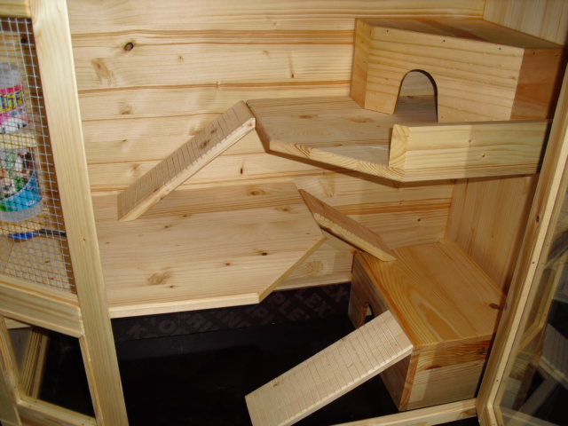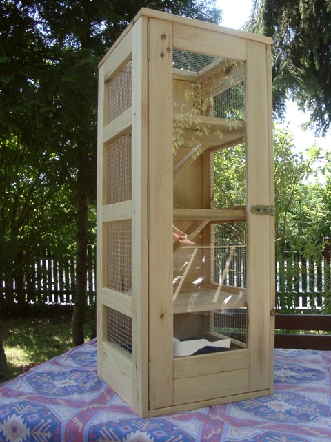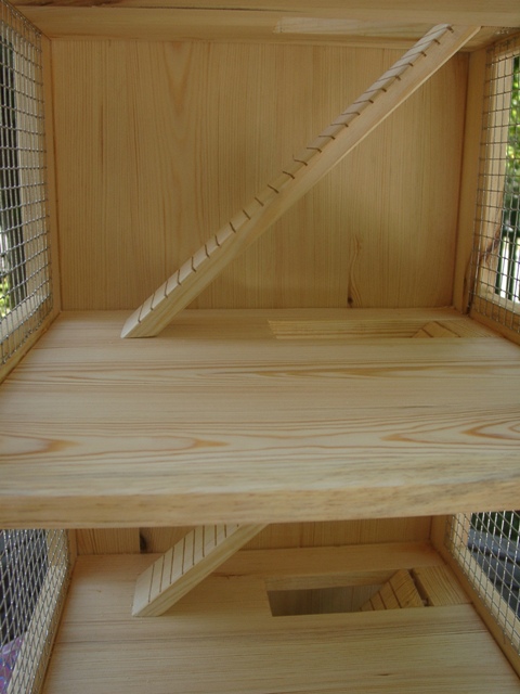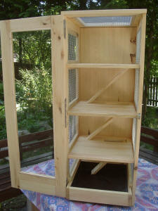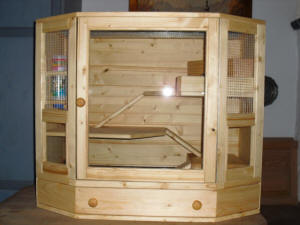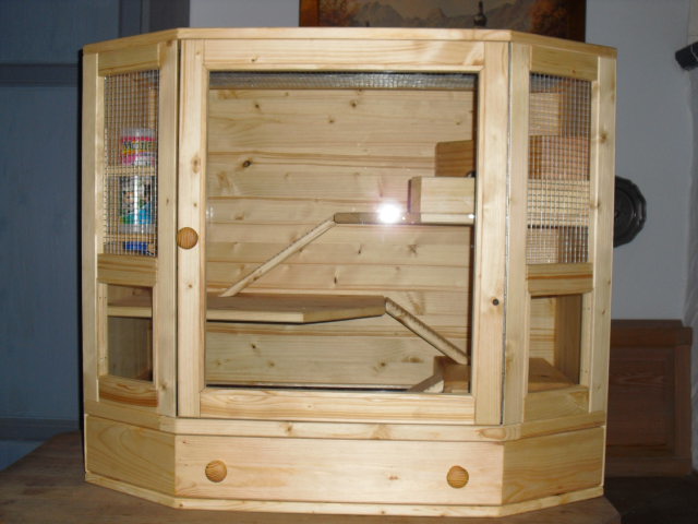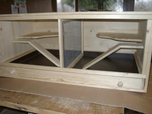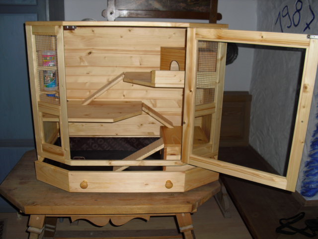 Luxusmodell in Fichte massiv mit Öl eingelassen.Der Käfig hat zwei Ebenen, zwei Häuschen, Trinkflaschenhalterung mit Trinkflasche. Die Ebenen sind über "Treppen" erreichbar. Der Käfig verfügt über eine Türe mit Glas. Die Schublade des Käfigs ist mit einer wasserfesten Platte ausgekleidet. |